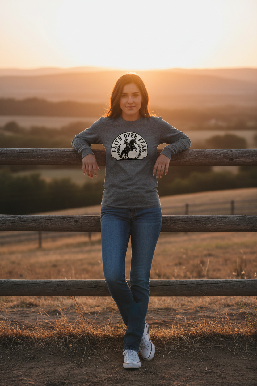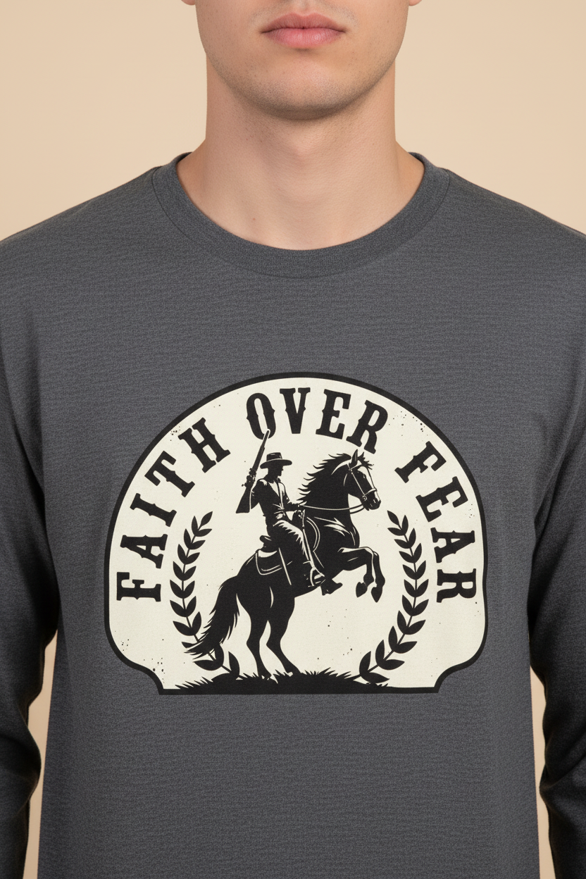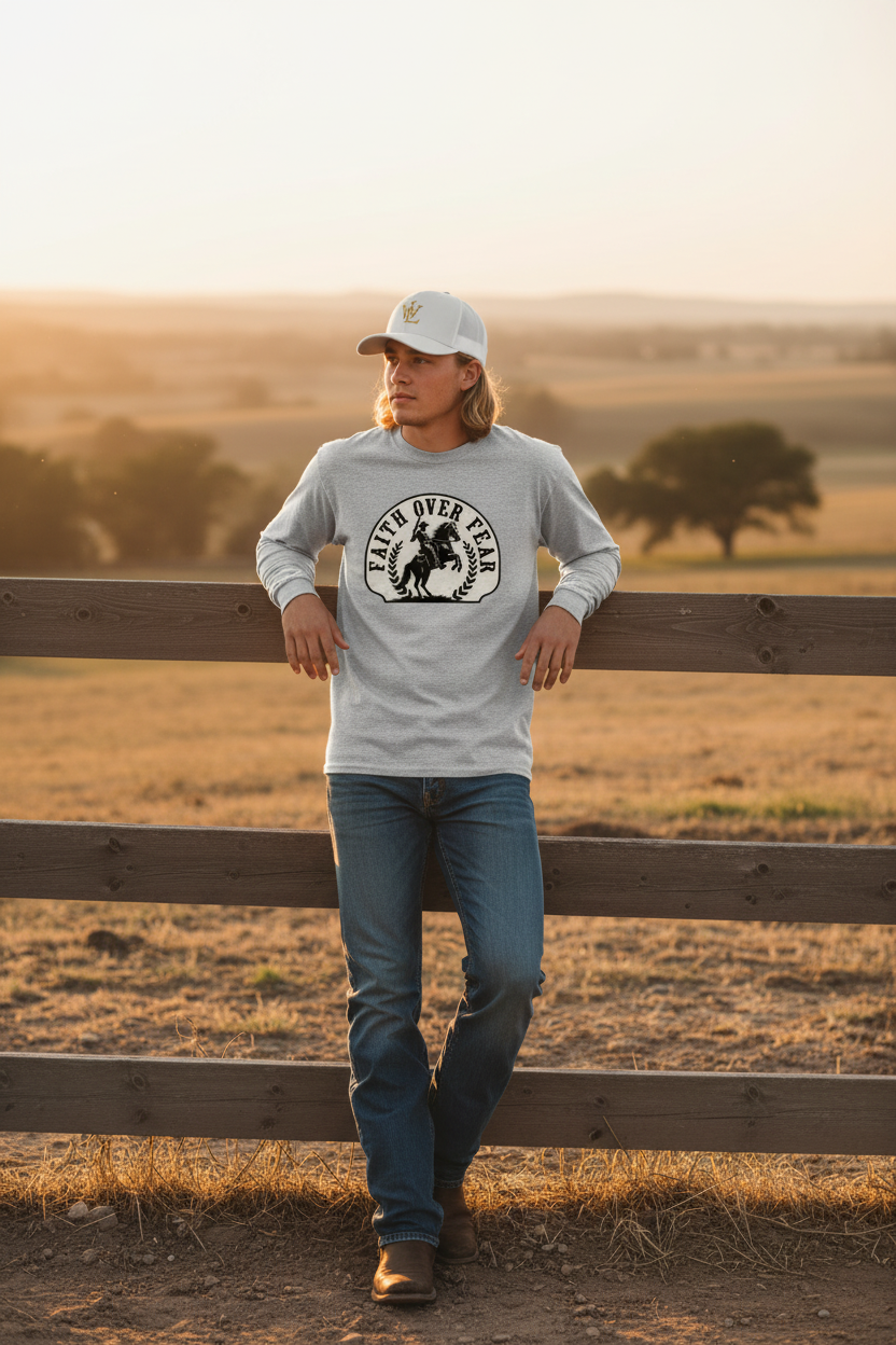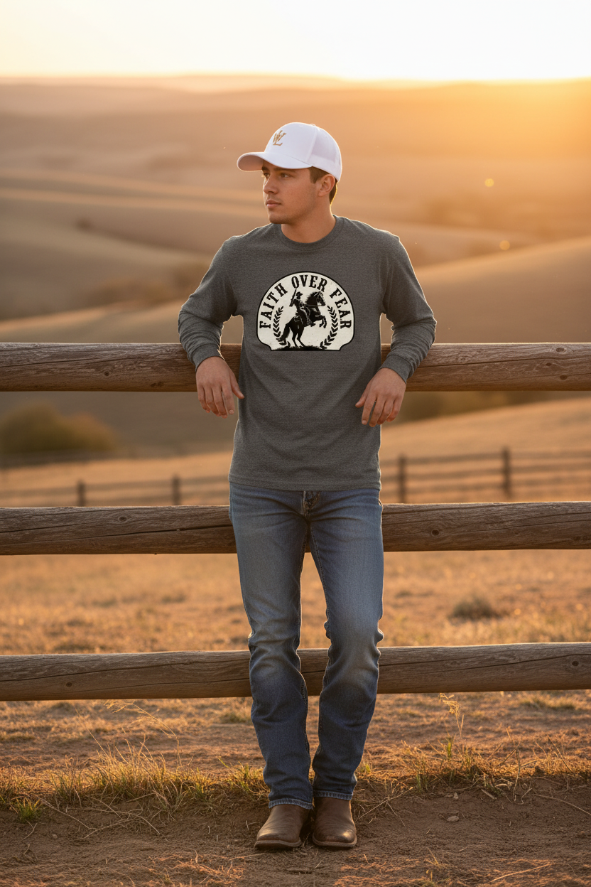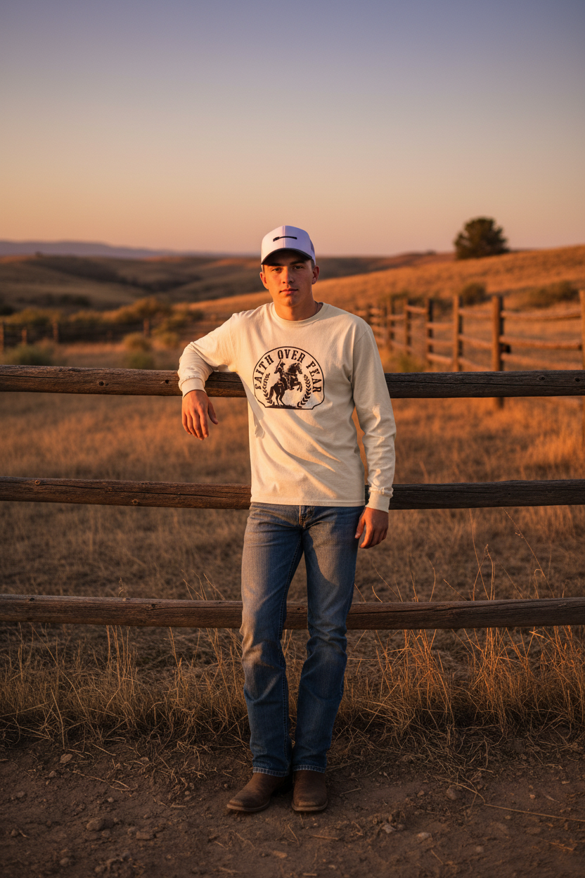 Our tees are crafted with premium fabrics and faith-driven designs to keep you comfortable and confident — whether you're working the ranch or walking downtown.