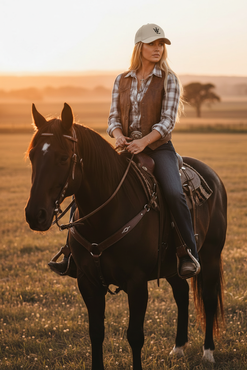 Western Wear - Brunette woman in Western Legacy longhorn hoodie with gold/black background